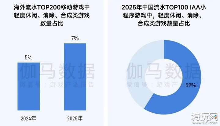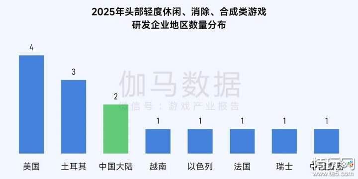 2025年,海外流水TOP200移动游戏中,轻度休闲、消除、合成类游戏数量占比从2024年的5%提升至7%,轻度玩法在头部市场持续走强,具备可观增长潜力。从研发商地区分布来看,美国、土耳其等海外地区的游戏企业目前在上述品类头部占有更多席位,中国大陆地区位列第三,仍有较大提升空间。值得注意的是,中国游戏企业在这一赛道已有一定研发积累与商业化经验。值得注意的是,2025年中国流水TOP100 IAA小程序游戏中,轻度休闲、消除、合成类游戏数量占比高达59%,可见国内轻度玩法领域规模化变现路径已相当成熟。随着海外轻度玩法市场需求持续释放,中国游戏企业在国内积累的经验加速迁移,在该赛道的竞争力与增长潜力值得重点关注。