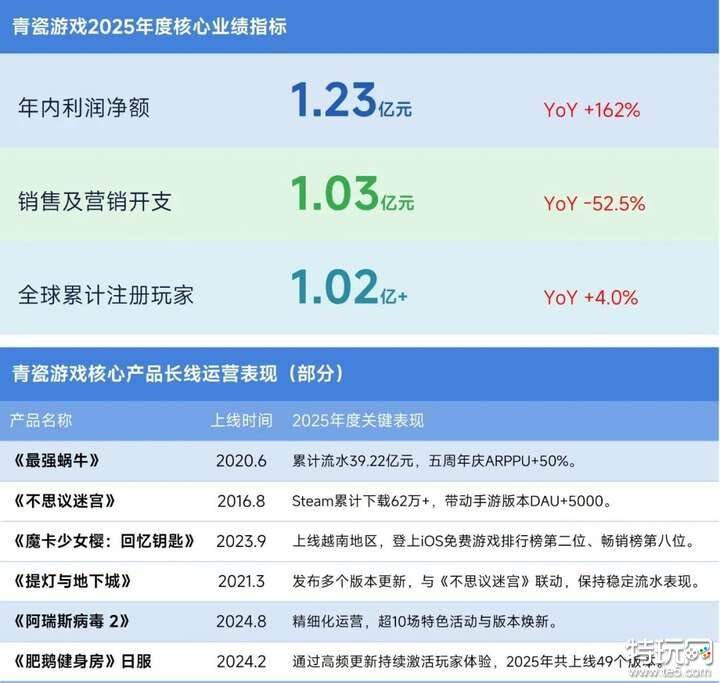 2025年,青瓷游戏坚持“精品化、全球化、长线化”的核心战略,不断夯实长青产品基本盘,推进全球化发行纵深布局,提升研发效率与产品确定性,并拓展多平台发行能力,成功进入2025年全球移动游戏产品营收TOP100企业。受市场大环境影响,以及核心产品生命周期自然回落与新品上线节奏阶段性波动,青瓷游戏2025年总收入有所下滑,降至4.56亿元,但录得盈利1.23亿元,较去年同期上升162%。营收回落而盈利能力逆势提升,主要得益于高效的管理运营及成本控制。2025年,AI技术深度融入策划、测试、美术、程序等环节,从工具化应用到流程化嵌入,成为青瓷游戏的核心生产力。同时,青瓷游戏在原创IP培育、长线运营深耕、游戏出海拓展等方面也取得了一定成果。自研旗舰产品《最强蜗牛》上线以来保持稳健增长,截至2025年末累计流水达39.22亿元、累计注册玩家2974万人,全年境内外贡献收入约2.74亿元。青瓷游戏持续深挖存量产品长线运营潜力,通过版本内容创新、活动节奏优化及精细化数据运营,不断增强用户付费意愿与产品黏性。全球化布局方面,青瓷游戏稳步推进旗下产品出海,巩固并扩大在全球重点市场的份额与影响力,2025年境外收入占比达43.2%。此外,在稳固移动端优势的基础上,青瓷游戏积极探索Steam等PC平台的发行路径,有效提升IP整体热度,拉动手游版本数据,也积累了跨平台运营与社区建设经验。2025年6月,青瓷游戏全球累计注册玩家突破1亿,充分印证了其持续打造高品质、个性化产品策略的有效性,也进一步提升了其在全球游戏领域的影响力。