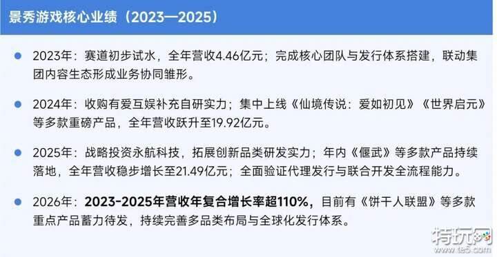 中国儒意旗下核心游戏业务品牌景秀游戏,以清晰的战略路径、全链条的研运闭环与全球化的生态视野持续打造增长动能,实现了业绩的跨越式增长,进入2025年全球移动游戏产品营收TOP100企业之列。自布局游戏业务以来,景秀游戏遵循“筑基—突破—提质”的阶梯式发展路径,在市场增速整体放缓的大环境下实现三年复合增长率110+%,增速水平处于行业前列。景秀游戏以“精品化、全链路、长周期”为核心,构建了覆盖研发、发行、运营、生态合作的全链路研运闭环,形成差异化的行业竞争优势,底层核心能力持续支撑业绩增长。在研运体系建设上,景秀游戏以自有品牌为核心,搭建“自研自发+联合开发+精品代理”三位一体的全链路布局,形成了覆盖产品全生命周期的运营能力。景秀游戏通过投资并购在核心赛道深耕与拓展全品类布局双向发力,2024年收购有爱互娱补齐SLG自研能力,2025年战略投资永航科技拓展创新品类研发实力。景秀游戏产品落地能力成熟,2024-2025年累计上线6款产品并实现长线稳定运营,形成了可持续的业绩贡献体系,验证了全链路研运模式的可复制性。全球生态合作层面,景秀游戏凭借集团资源与自身运营实力,与育碧、EA、腾讯、Devsister、Scopely等全球头部游戏厂商达成深度战略合作,合作维度覆盖内容共创、IP联合开发、全球发行联动等。技术研发层面,景秀游戏始终坚持技术创新驱动内容升级,落地AI非物理动捕、程序化内容生成等核心技术,有效提升研发效率、缩短产品开发周期,为精品化产出提供技术支撑。