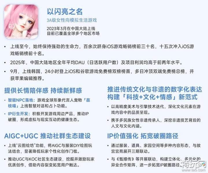 祖龙娱乐以"精品化、多品类、研运一体、全球化"为核心战略,聚焦优势赛道,加强差异化布局,2025年游戏业务收入13.04亿元,成功进入2025年全球移动游戏产品营收TOP100企业之列。截至2025年12月31日,祖龙娱乐共推出了24款精品手游,在超过170个地区市场发行了可支持14种语言的多个地区版本,产品矩阵涵盖MMORPG、女性向、策略卡牌、放置RPG和SLG等多种品类。在女性向这一核心优势赛道,旗舰产品《以闪亮之名》自2023年3月中国大陆上线以来,陆续登陆全球多个地区市场并取得亮眼成绩。《以闪亮之名》坚持以女性玩家视角为核心,并通过不断引入新技术、拓展新玩法、升级新体验,让玩家长期体验陪伴感与新鲜感,展现出“长青长新”的卓越运营能力。值得关注的是,祖龙娱乐以游戏为载体,也在文化出海方面作出了积极探索,在丰富自身内容生态的同时,持续拓宽女性向IP的破圈路径。此外,祖龙娱乐还对组织架构进行调整,将打造《以闪亮之名》的VVANNA工作室升级为独立事业部,女性向赛道的产能保障体系进一步强化。年报显示,祖龙娱乐产品储备中包含一款使用虚幻引擎5制作的女性向游戏《项目K》,致力于通过先进的3D视觉技术打造充满幻想的游戏体验。凭借对女性玩家在游戏内容等方面体验偏好的深度理解,这款全平台女性向大作有望成为新的增长引擎,进一步巩固祖龙娱乐在全球女性向游戏赛道的领先地位。