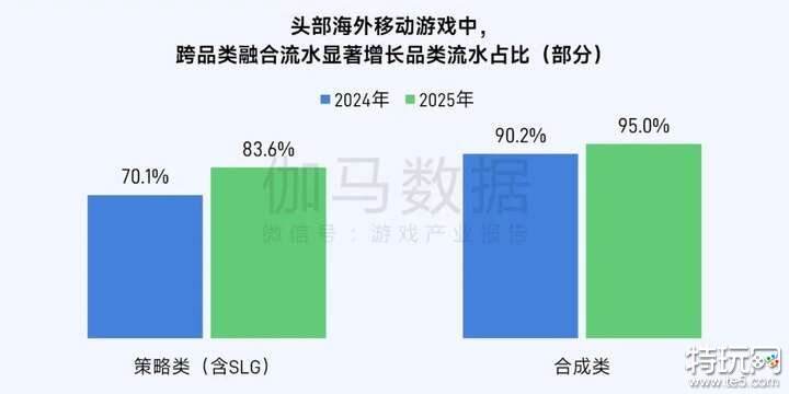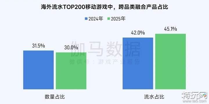 2025年,海外流水TOP200移动游戏中,跨品类融合产品数量占比从31.5%小幅回落至30%,流水占比则从42%升至45.1%,均在头部产品中占据一定份额。跨品类融合早已成为重要趋势,而融合的方向和深度显得愈发重要。从融合品类来看,2025年品类融合产品流水增长主要来源于策略类(含SLG)与合成类,而消除类、卡牌类等较早推行融合策略的品类,融合产品流水占比反而出现下滑。在品类融合自身生命周期中,把握市场需求,深度重构玩法逻辑,提升产品质量,才是维系竞争力的关键。
