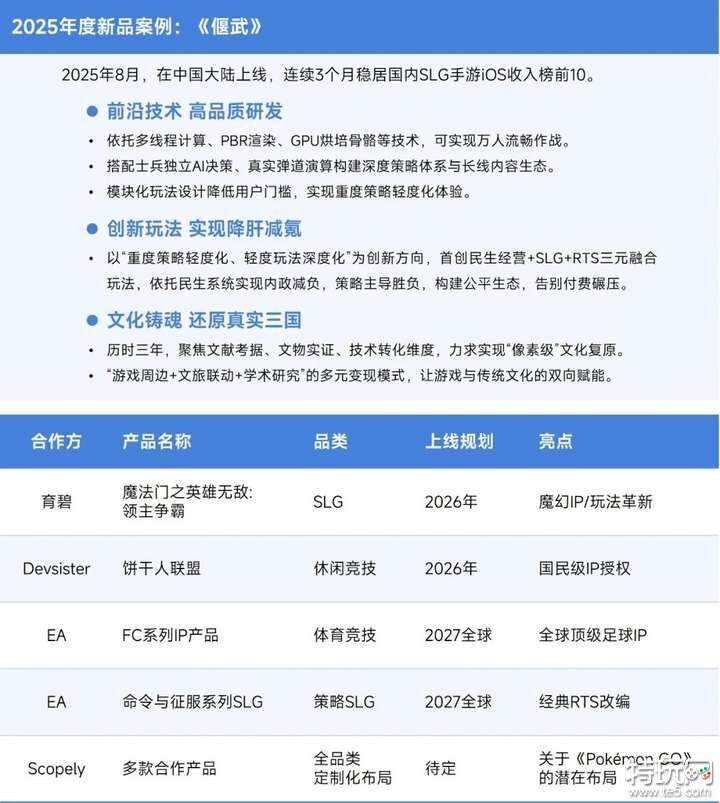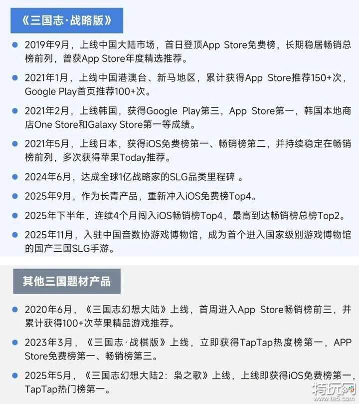 灵犀互娱致力于研发和发行面向全球的精品游戏,国内海外双主市场并行,打造多元产品矩阵,进入2025年全球移动游戏产品营收TOP100企业榜单前50名。灵犀互娱旗下旗舰产品《三国志·战略版》(以下简称“三战”)是国内SLG品类的长青代表,全球累计玩家数量超过1亿。自2019年9月上线以来,长期稳居iOS畅销总榜前列,2025年六周年庆期间重回iOS畅销榜前三,在随后四个月内,更连续四次闯入iOS畅销榜Top4,再度验证了产品的长线生命力。灵犀互娱以“三国志”IP为核心战略资产,依托《三战》积累出海经验,形成了玩法创新和文化渗透为核心的本地化运营路径。在运营期间《三战》还连续多年在游戏外推出诸如《问曹》纪录片等优质内容,不断拓展三国文化的表达边界。2025年,《三战》持续在中国港澳台、日本、韩国等地区市场iOS畅销榜保持稳定排名,成为中国SLG产品在亚洲市场长线运营的代表案例之一。在《三战》之外,灵犀互娱进一步纵深开发三国题材产品矩阵,拥有《三国志幻想大陆》、《三国志·战棋版》等经典策略游戏。2025年,三国卡牌续作《三国志幻想大陆2:枭之歌》上线,延续三国题材的内容积累,以差异化玩法创新尝试触达更广泛的卡牌用户群体。围绕三国题材形成的多产品联动生态,使单一IP的市场价值得到梯次释放,未来全球影响力也有望进一步提升。