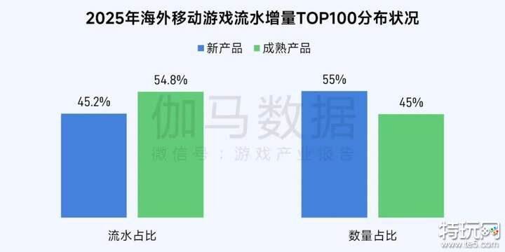 2025年,海外移动游戏增量TOP100中,成熟产品流水占比达54.8%,高于新产品的45.2%;但从入榜数量上,成熟产品仅占45%,新产品则以55%占据多数。这表明,成熟产品单品变现效率显著优于新品,长线运营价值进一步凸显。这一格局与头部榜单高度固化的整体趋势相互印证,反映出全球移动游戏市场增量空间正在加速向头部成熟产品集中。主要原因在于,成熟产品凭借稳定的用户基础、持续迭代的内容生态与深度付费转化能力,已建立起先发优势,使得新品突围概率减小。