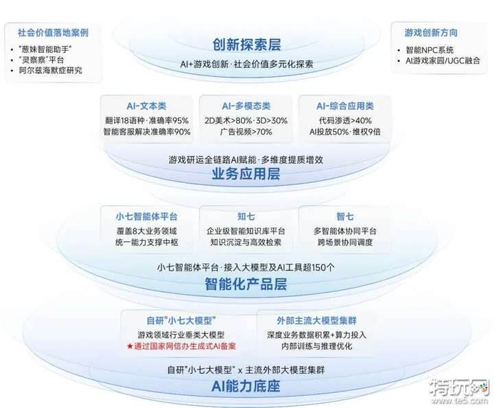 三七互娱高度重视AI技术,已构建起以AI能力底座为核心、涵盖智能化产品层与业务应用层的完整AI架构,形成覆盖游戏研运全链路的AI赋能体系。三七互娱自主研发的游戏领域行业大模型“小七”成为广东省首批通过国家网信办生成式人工智能服务备案的游戏垂类大模型之一,在算法安全、数据合规、内容治理等核心能力上达到国家级标准。以“小七大模型”为核心、叠加主流外部大模型集群,三七互娱持续推进AI能力体系升级迭代。在业务应用层面,AI已深度嵌入游戏研运全链路,在发行与运营环节以及职能管理方面均实现多维度提质增效。三七互娱还通过设立“AI效率委员会”、开展多种活动,加强AI人才培养,推进AI渗透率持续提升,各业务管线优化升级。