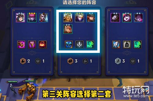 1、第三关我们选择第二套阵容:三星俄洛伊、三星伊泽瑞尔、两星女枪、两星奎因。