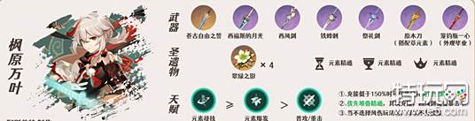 2.枫原万叶搭配风套(翠绿之影)4件套降低敌人对应元素抗性,自身固有天赋提供额外元素伤害加成,