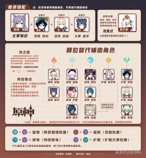 因为雷元素打什么都沾点免疫,所以推荐了双风大招流,刻晴的大招只需要40能量,搭配双风可以更快的恢复大招,并且温蒂聚怪的情况下刻晴大招可以完美释放,再搭配香菱的双脱手超载大招里真的是“剑光如我,斩尽牛(芜)杂”