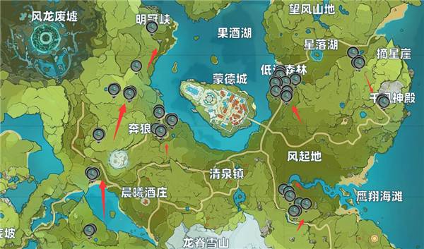 最开始有分区地区分布,里面标着序号和总数。可以照着图片分区在自己的图上标点(比如某区域有13个,那么就在图上大概标出点位)然后做日常或者跑图的时候可以绕点路从这些标志旁边经过,靠近后地图上不弹信号就说明这个神瞳已经拿过了。验证一个改一个标志(我是星换成四叶草),一个地区验证完之后就清除标志换下一个区域。