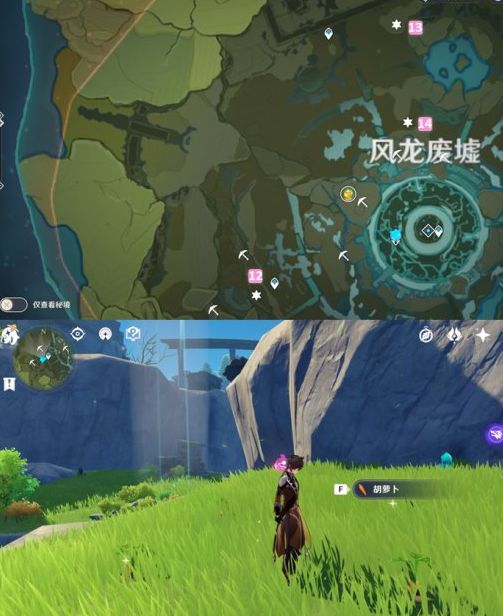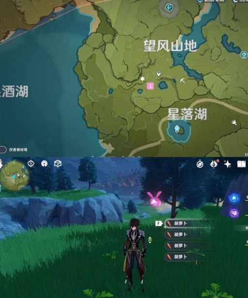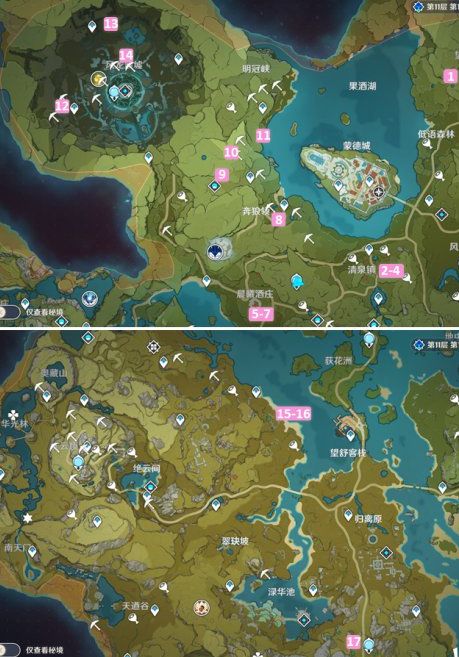 先来个提瓦特大陆胡萝卜点位图,上面蒙德下面璃月,方便后面找具体位置。我用的是✡标记点位。