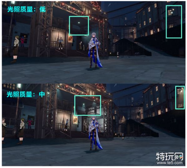 但为什么又建议大家保持在『中』呢?主要是因为这是游戏中部分光照场景产生丁达尔效应的最低限度,大家注意下下图中我框选的灯光: