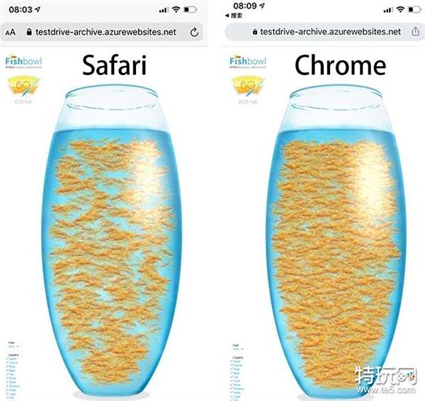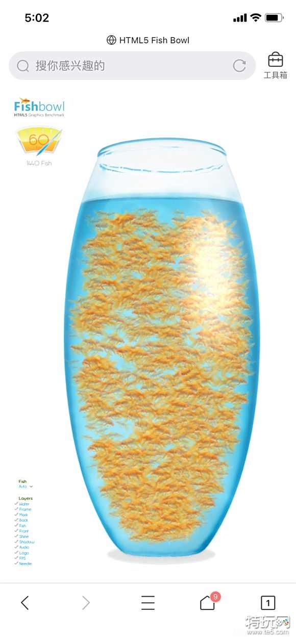 Fishbowl字面意思为“玻璃鱼缸”,顾名思义,是通过在网页当中一个盛满鱼的鱼缸的画面来测试设备的HTML5性能,其中可以设置鱼的数量,测试过程中玻璃鱼缸中的鱼是在不停游动的,在不同设备中鱼的数量相同的情况下,其游动速度越快,证明HTML5性能越强,而页面左侧也会给出相应的分值,同样,分值越高越好。