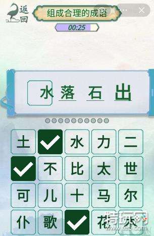 2、接着是完成第一个水落石出成语,后面是根据前一个成语中的最后一个字作为开头的成语。