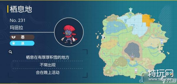 玛狃拉是恶和冰属性的宝可梦,想要抓玛狃拉可以去地图北部的霜抹山的东部边缘的陆地上面找,它栖息在有厚厚积雪的地方,不常出现,会在晚上活动,具体分布区域如下图。