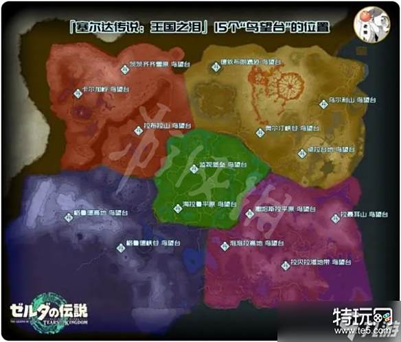 塞尔达传说王国之泪游戏中的鸟望台可以解锁该区域的视野,可能很多玩家还不太清楚15个鸟望台的分布位置。下面小编给大家带来塞尔达传说王国之泪全鸟望台分布图,还不清楚鸟望台分布位置的小伙伴一起来看看吧。