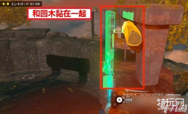 到下方的池塘中,用究极手将圆木和木板黏在一起抽干池塘中的水。