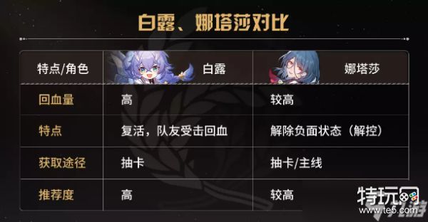 1.0版本目前只有两个奶妈角色,分别是“娜塔莎”和“白露”。白露的回血量要高于娜塔莎,而且带有复活功能,所以对萌新玩家而言,白露的游戏体验无疑会更好,有白露选白露。不过娜塔莎也是有自己的特长的。她的战技带有驱散能力,用于给队友解控也是极好的,功能性相比白露要更好一点。因此对于有一定游戏理解的玩家而言,娜塔莎有时反而能打出更好的效果。