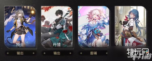 这四名角色都是主线剧情要送的,所以人人都有。而这个配队采用的思路是标准的“输出生存2+2”的思路,其中三月七和娜塔莎负责生存,三月七提供单体护盾和群体概率冻结,娜塔莎提供回血,且这二者都有一个小小的驱散(净化)能力,可以解除我方单体角色的一个负面效果。整体的功能性倒还可以。物主和丹恒负责输出,其中物主是毁灭命途,对单对群均可,丹恒是巡猎命途,主要用于对单。整个队伍的搭配是比较合理的,足以帮助萌新小伙伴们应对开荒阶段。