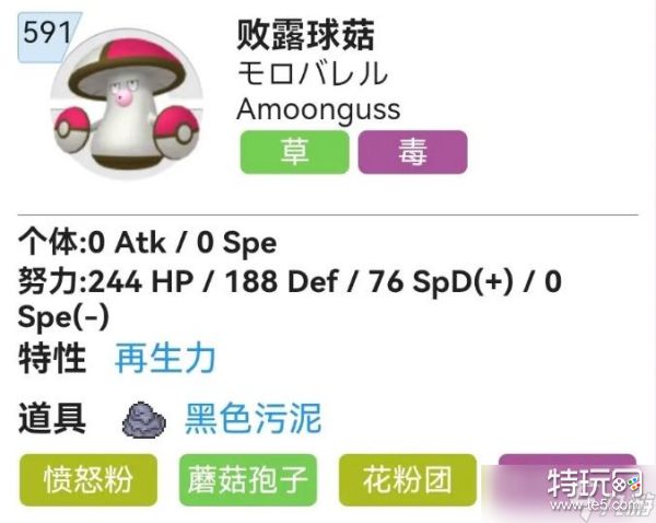 功能分析:雨天队的败露球菇可以不再惧怕火系宝可梦,因此在努力值方面进一步提高了自己的综合耐久,配合道具黑色污泥,承伤能力大幅度提高,在这套队伍体系中既可以作为顺风,强化,磷火,冻风等手段达成的掩护者,也可以作为队伍的对于草电斗妖等属性的联防轴,时不时再甩出一份蘑菇孢子,让对手永远地沉浸在睡梦之中。