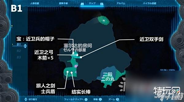 位于海拉鲁城B1。从海拉鲁城B2往上走到B1,爬完楼梯后贴着墙壁绕一圈到达塞尔达的房间,暖炉上方可以拿到近卫弓,里面的小房间里可以找到近卫的双手剑。