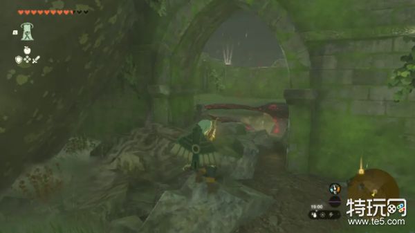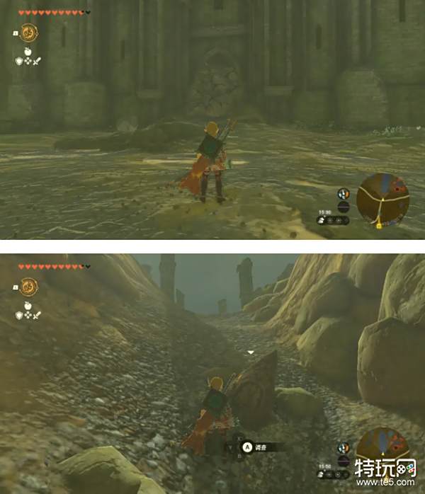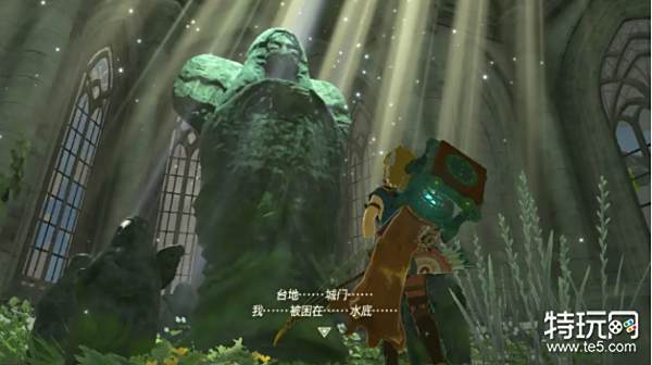 来到城下,发现一堆可破坏的石头堵住了城门,用炸弹箭破坏碎石,城门的积水被清除,同时发现一尊隐藏的魔人像,上前对话。