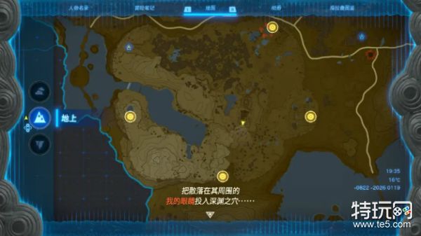 任务要求去标点处找寻魔人像的四只眼睛,并将其投入到地底的深穴之中,我们来到地图北侧,开启北侧地表的神庙方便之后从地底传送回地面,之后来到东北处的标点,将藏在水池中的眼睛丢进北侧的深穴,随后跳入深穴。