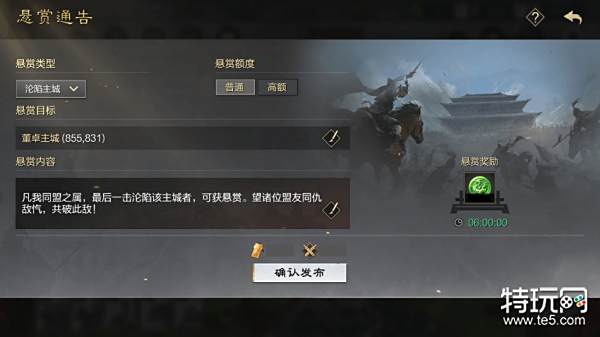 处于聚义或20级及以上同盟内,且本赛季历史势力值≥5000的主公,皆可在同盟/聚义中发布悬赏。发布时,需消耗一定数量的四通玉符和武勋,并可设定相关的悬赏类型、悬赏额度、悬赏内容。悬赏额度分为普通、高额两种,悬赏内容可选择土地坐标和自定义悬赏公告文本,悬赏类型一共有8类。
