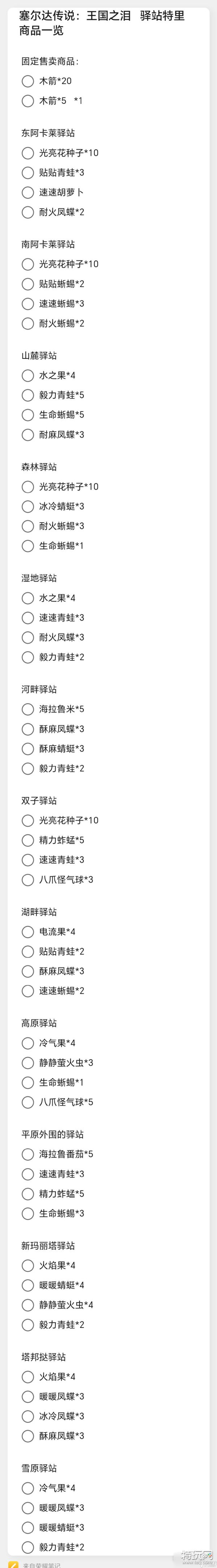 《塞尔达传说 王国之泪》驿站特里卖的货物清单