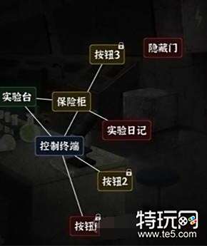 5、然后点击隐藏门,点击密室、拖动紫外线灯到实验日记,打开日记发现点点,得知药水调配器顺序是蓝、绿、红、黄。