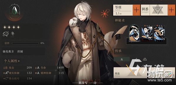 冬是木属性角色,其精神防御评级达到了A+、生命值评级为A、物防B+、攻击和技巧皆为B。从这里就可以看出来这个角色的作用并不是输出位,而是更加偏向于是承伤和辅助作用,实际上他能够为敌方带来一定的DEBUFF效果,而且可以为我方群体带来增益。