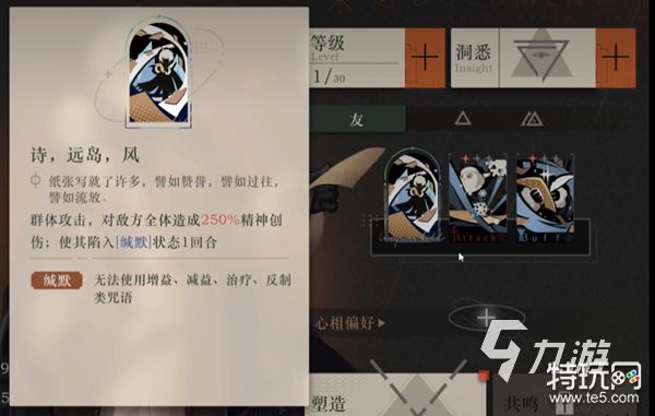 在战斗中使用技能【雀】能够给敌方单体带来较高的精神创伤(主打的也就是精神伤害了),在强化技能之后能够给目标施加缄默效果,在生效期间内敌人没有办法使用增强、治疗、削弱以及反制类型的技能效果。技能【纸】则是为我方全体队友带来增强的效果,提升全员的暴击防御属性和抗暴率,增强生存属性。技能【写于萨哈林】(诗、远岛、风)则是一个群体攻击+DEBUFF的攻击手段,不仅是可以带来大量的精神攻击,而且还可以施加1回合的缄默效果。这个效果因为是全体的,所以在战斗中的作用还是比较大的。