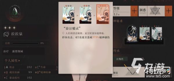 一技能“春日精灵”,它是一个群体攻击效果的技能,在进行战斗状态时,能够对敌人造成150%的精神创伤,这对于小伙伴们来说是非常给力的,能给大家在战斗中带来绝对的优势。