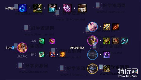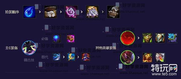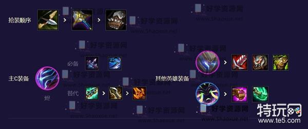 1、后期阵容,前期拿3混沌+2AI过渡,烬装备先给卢锡安。