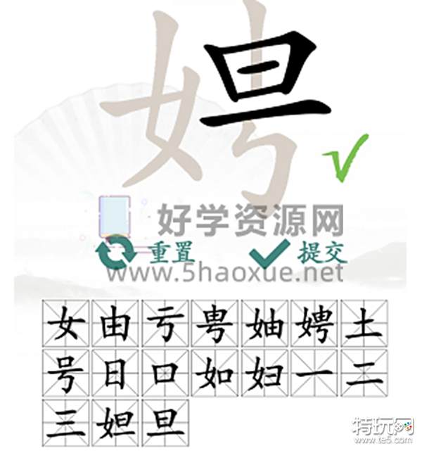 答案:女、由、亏、甹、妯、娉、土、号、日、口、如、妇、一、二,三、妲、旦。