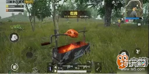 当淘汰最后一名敌人后,对敌人完成最后一击的玩家的游戏界面上将会出现“烤鸡”按钮,点击按钮后就会进入狂欢时间。