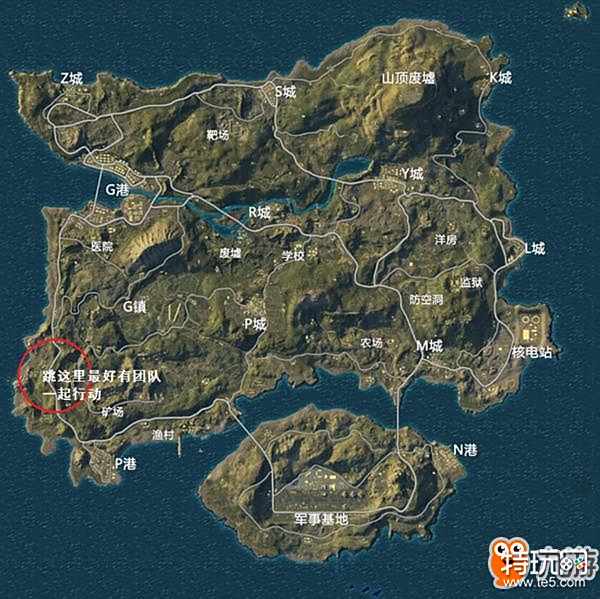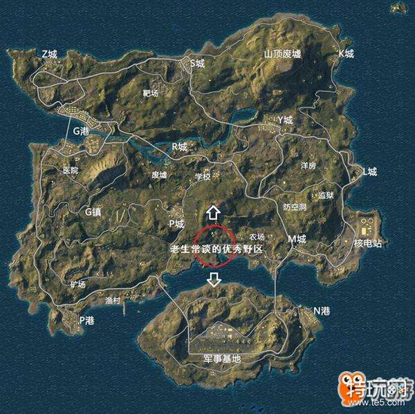P城与农场的中间的野区,如果选择这里降落一定要注意看安全区的位置,这里的物资相对前两个点会差一些,但是这个点位背靠山峰,可以为我们在游戏中期提供一个非常好的制高点,但是很多时候我们会因为装备不足,没有办法发挥这个点位的优势;不过登上山峰之后我们需要做的并不仅仅是在山上击杀敌人,也可以利用视野优势观察敌人的动向,然后向比较安全的位置进行转移。除此之外,如果军事基地不在航线上,也可以立刻向下转移,利用船只在军事基地偷一波发育。同时需要注意的是,在当前游戏环境下,M城和农场都是人比较多的点位,万事小心为妙。