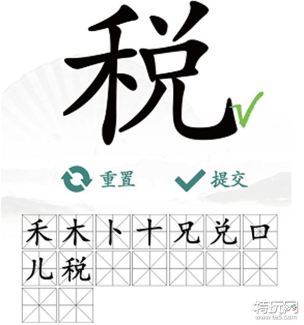 1、首先我们从税字整体来看,从困难到简单的部分,获得文字:禾、木、卜、十、兄、兑、口、儿、税。