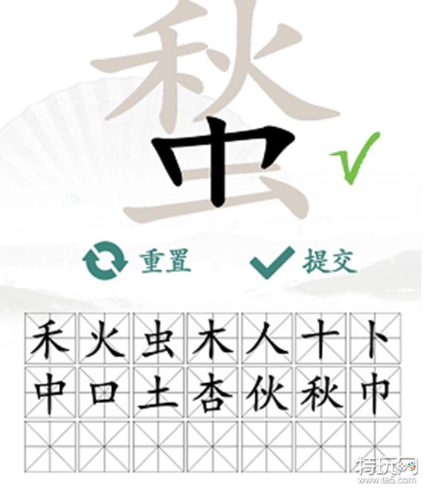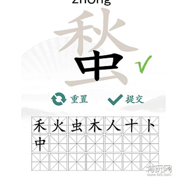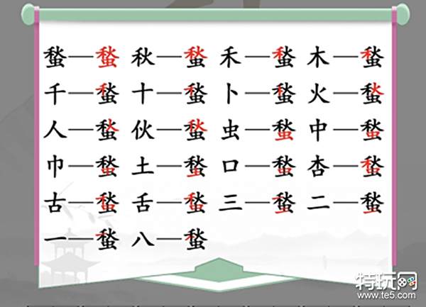 2、然后我们把蝵字组合一部分起来看看,可以获得文字:口、土、杏、伙、秋、巾。