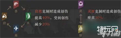 3、自然属性彼此克制能够提高40%的创伤效果,降低20%的创伤效果,灵智之间相互提高30%的伤害。