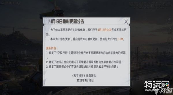 “空投行动”更新之后,连续迎来“小更新”,主题创意模式“空投行动”连续修复,如今又更新1.1M后再次进行修复。