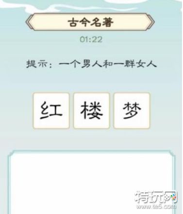 这个关卡的提示是“一个男人和一群女人”,对应的古今名著是【红楼梦】;首先用绞丝旁和工组成红字,接着是用木、米和女组成一个楼字,这边俩个字就是写出来了;最后将俩个木放上去,再将夕字放上去就是可以变成一个梦字,最后也是得到了红楼梦这个古今名著。
