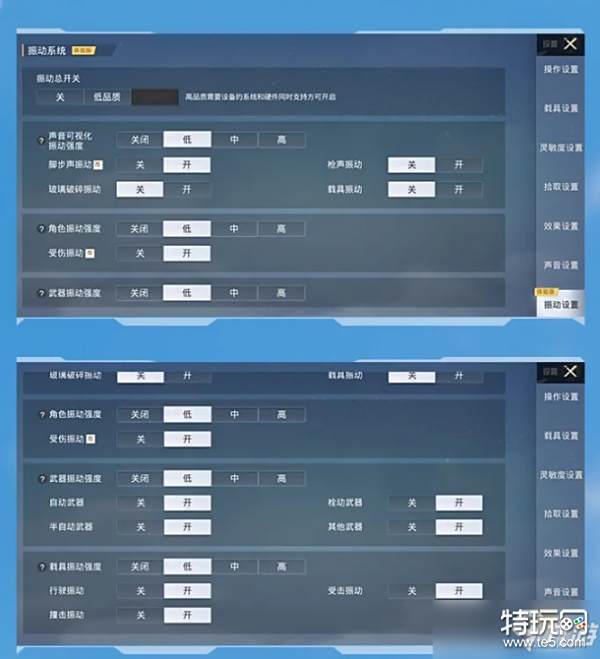 振动系统:将游戏中的各种行为,通过振动触感实时反馈至设备,开启后将带来新触感,现已支持角色、武器、载具、声音可视化振动等部分行为的实时触觉反馈。(部分功能需要系统与设备同时支持才可开启)