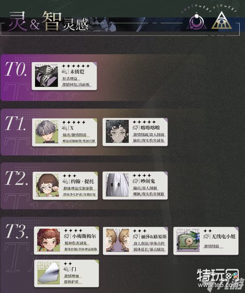 T2:这些角色在特定的战略情况下具有一定的价值。尽管相对于TO和T1角色来说,他们的实力稍逊一-筹, 但在特定场合中,他们能够发挥出独特的战术优势。如果您需要填补某些特殊需求,可以考虑投入资源培养这些角色