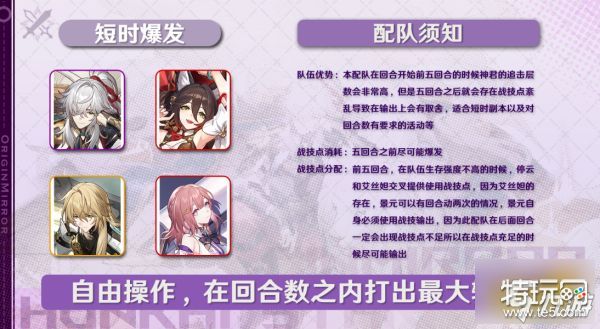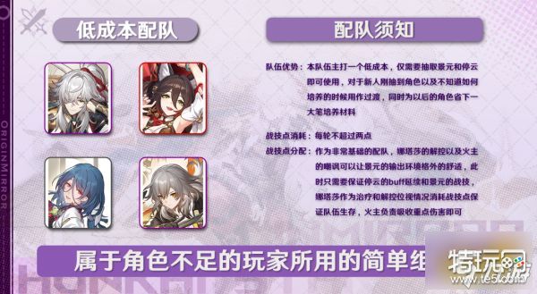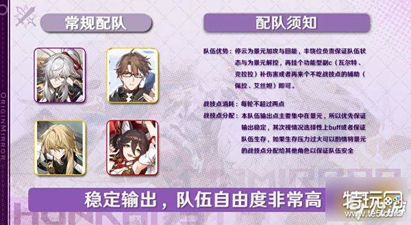 在配队方面,景元作为一名输出能力强但回能缺口和输出增益缺口都较大的角色,更推荐使用三保一的阵容。而且景元最为重要的就是【神君】的层数叠加,所以如何高频使用战技、终结技便是景元配队的核心所在。
