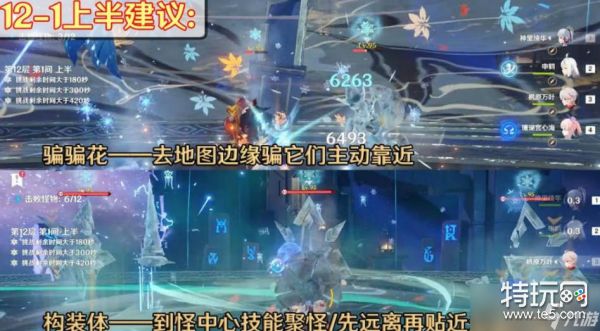 1、12-1上半,打骗骗花建议开局往边缘跑,主动吸引它们遁地聚集在你脸上。千万别去主动追,等它们自己过来即可。钩装体建议用风系聚一下,在隐身之前快速击杀即可。上述两种原魔分两波出现,且都是始终维持在场上3只,灭1只添1只,共6只。