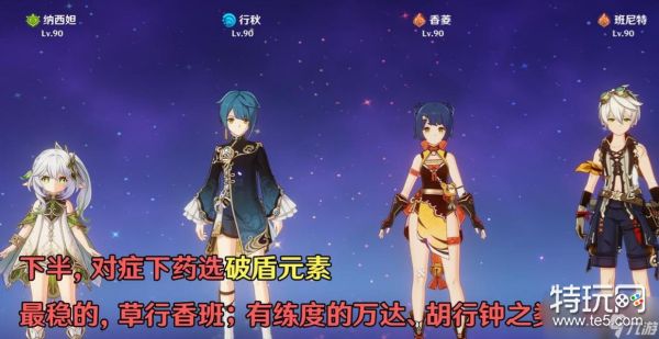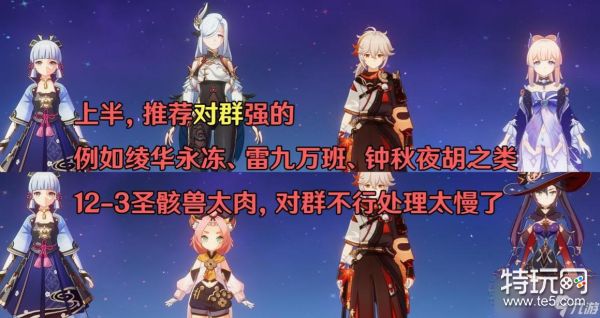 上半以对群为核心(如若练度不够最好避开水草高抗属性),推荐:绫华永冻流、雷九万班、钟秋夜胡。
