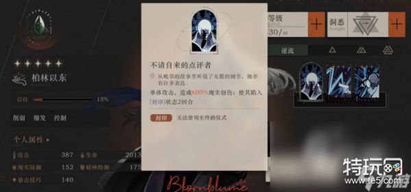 技能方面,除了大招【不请自来的评论者】是单体袭击技能以外,其余两个技能都可能对敌方群体使用。不请自来的评论者除了能够酿成多量(600%-1000%)的理想创伤和紫外,还可能个仇人施加三个回合的封印效果。被封印的仇人没有办法使用自个的大招。技能【留意袖口】为群体袭击技能,能够对敌方最多两个单元酿成多量的物理伤害,假如其本义就带有驾御和减益效果的话,则可能得到肯定额外伤害。技能【贯注墙外】是一个2-3回合奏效的DEBUFF技能,可能消沉敌方集体的两个抗御属性而且轻易收到更多的伤害。