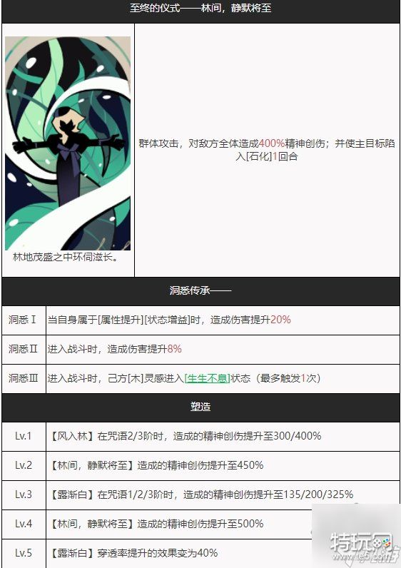 传承三决定了槲寄生在纯色木队时,传承收益才能最大化,且传承三可以触发传承一,让传承一变成常驻状态,在她作为主C时可以不强绑定增益拐,生生不息提供的单局永久吸血率和受创回复在她搭配纯色木队时可以极大的提高队伍生存能力。(公测削太狠了,完全把她从顶级木拐整成了偏向木C)