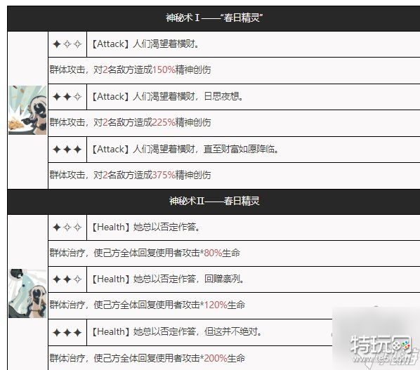 这个角色一共拥有三个攻击效果,一技能是春日精灵,属于一个群体攻击技能,可以快速消磨对手血量,在造成精神创伤的同时也能快速削减他们的伤害效果,为团队带来绝对的战斗优势。她的第二个技能可以帮助群体成员进行治疗,快速恢复友方队友的血量,最大限度保障队伍的续航能力。至于恢复的数值则是根据拉拉泉的攻击伤害来决定的,她的攻击实力越强,恢复效果就会越给力。