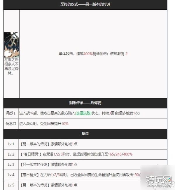 最后一个技能为单体攻击技能,这个技能属于一个比较强势的收割型技能,可以快速对敌方单位造成450%的精神创伤,如果在给这个技能不断升级的话,那么她的激情也可以快速削减,玩家可以直接针对敌方主力进行攻击,快速的压制住对手。