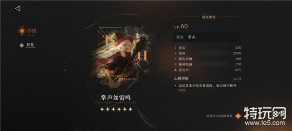 非常强力的心相,简单粗暴地给暴击爆伤,比较可惜的是白板攻击力最低,仅为330,且爆伤只增幅单体技能。不过瑕不掩瑜,哪个主c不想多来点暴击率呢?